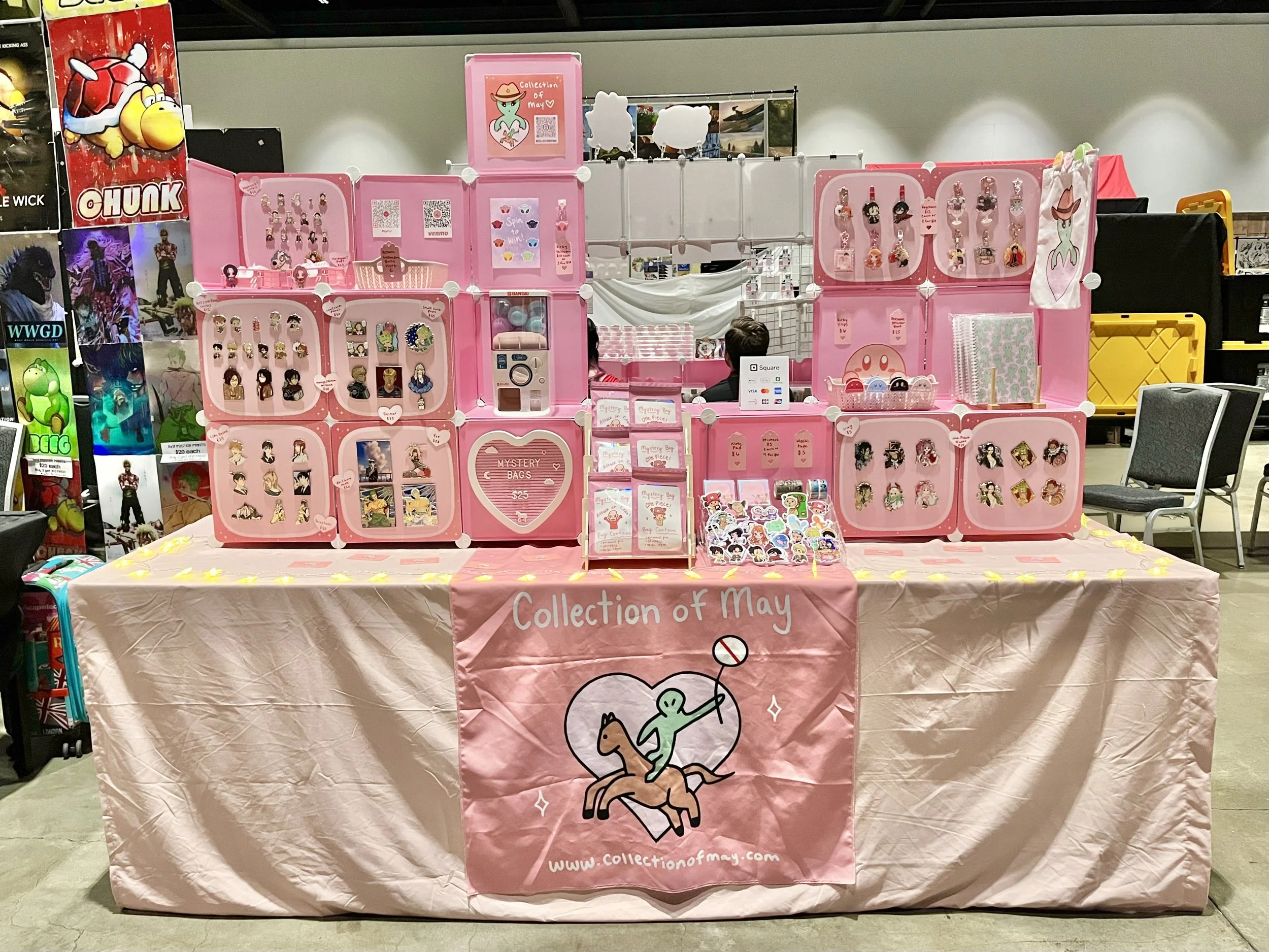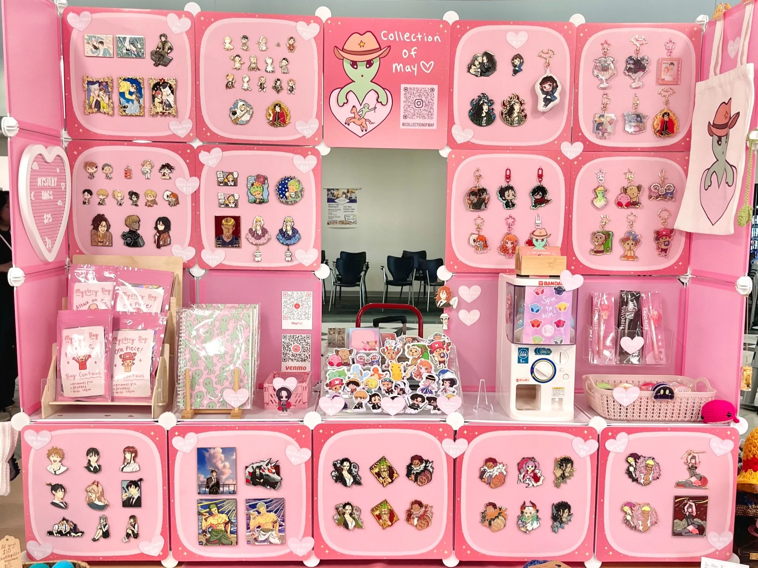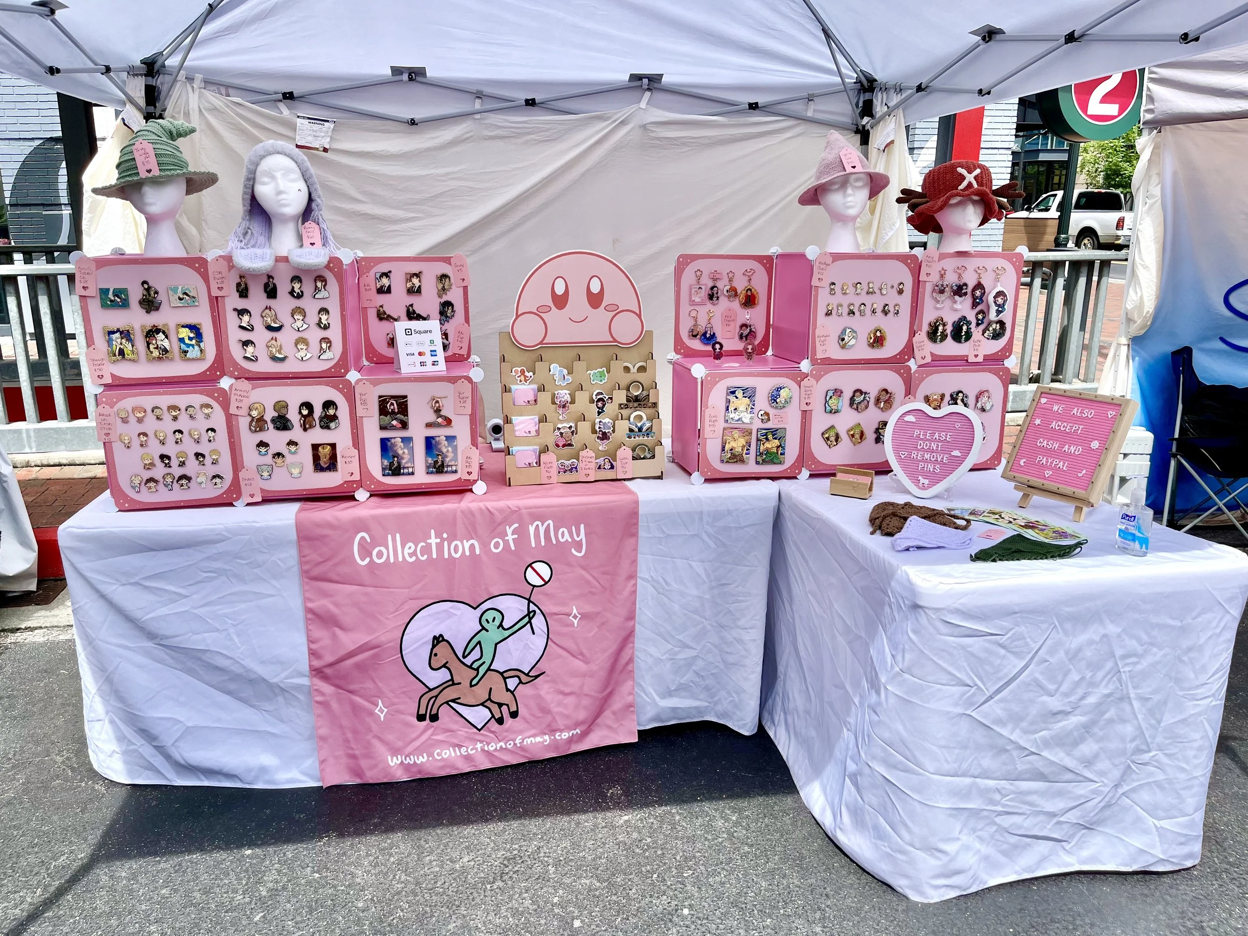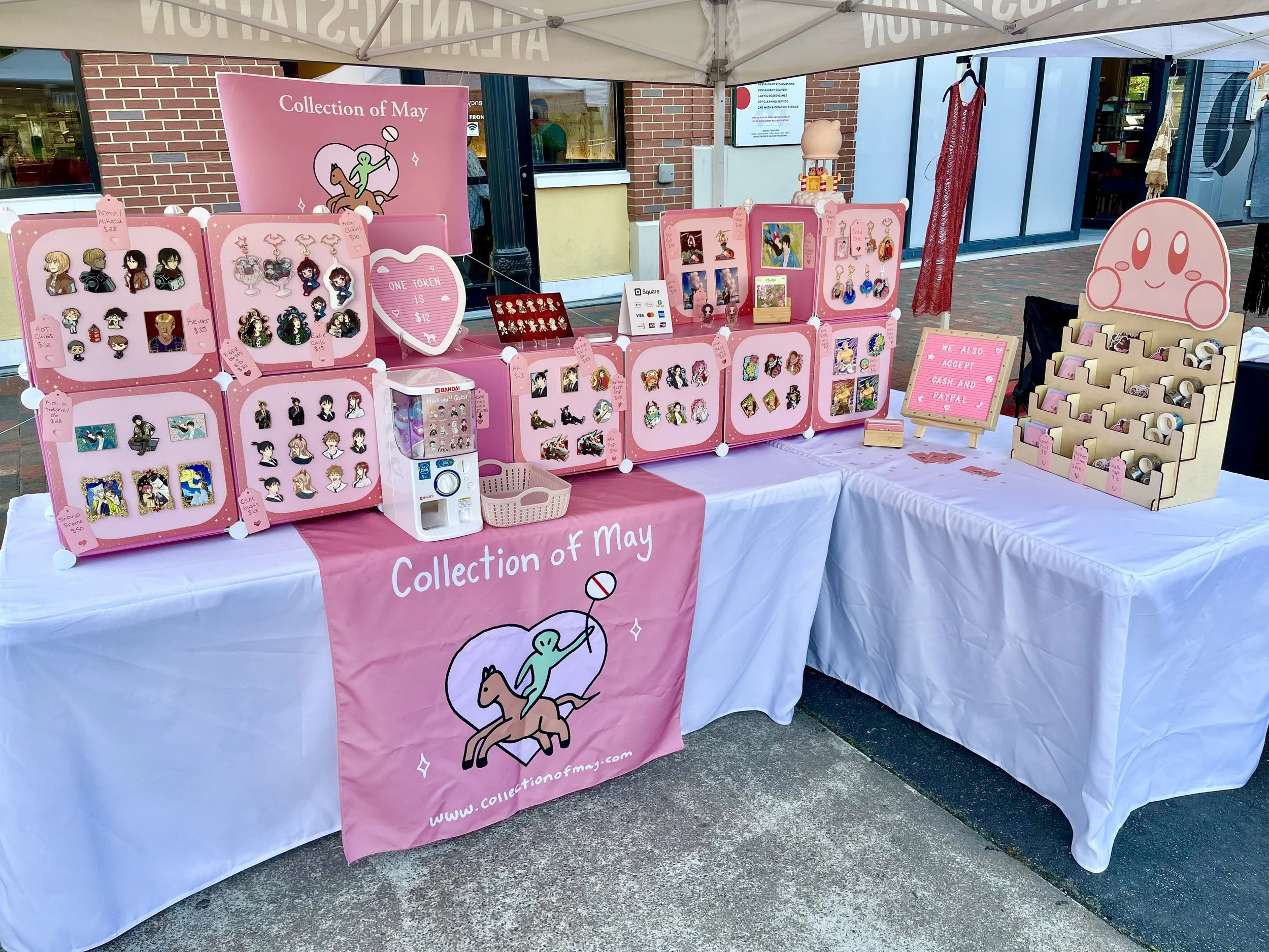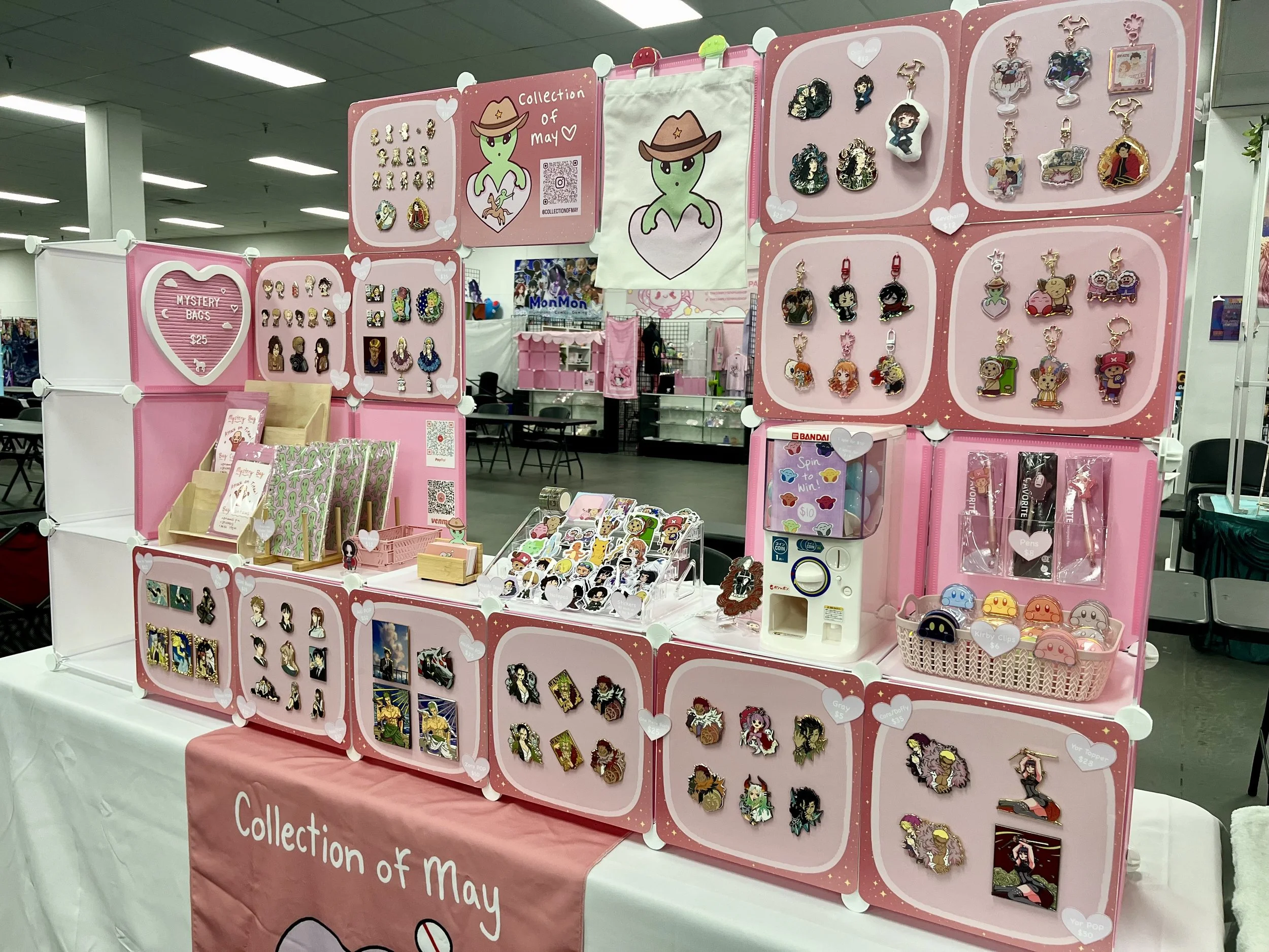 Below are photos showcasing some of the products I sell, as well as examples of my table display from previous events. My main product is enamel pins, which I have created more than 300+ over the years in all shapes and sizes. I also create vinyl stickers, keychains, acrylic standees, tote bags, reusable sticker books, plushies, and stationary items, including binder clips, washi tape, notepads, and pens. I offer a lot of product and character variety, and I also have items of all prices ranging from $3 to $75+! If you have any questions, please feel free to reach out at collectionofmay@yahoo.com.